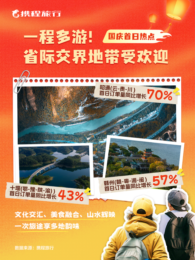 此外,地處省際交界、可「一程多遊」的城市也以獨特的區位魅力吸引着越來越多的遊客。攜程數據顯示,雲南昭通假期首日訂單增長70%,江西贛州增長57%,湖北十堰增長43%。