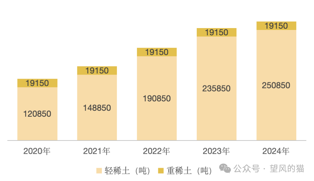 2020-2024年,中國稀土礦開採和冶煉分離總量控制指標平穩增長,輕稀土開採指標年均複合增長率為20%,而重稀土開採指標則維持不變。