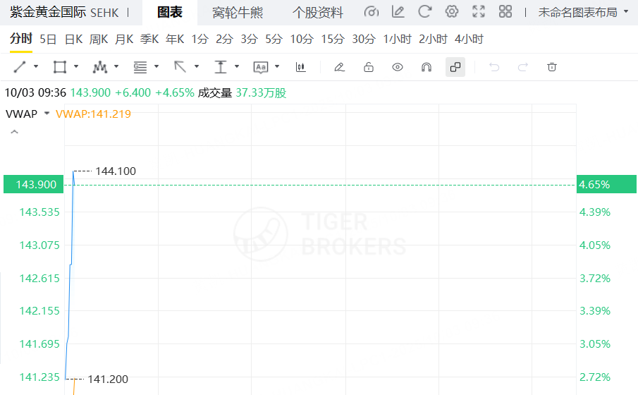 10月3日,紫金黃金國際盤初漲超4%,獲納入恒生綜合指數。