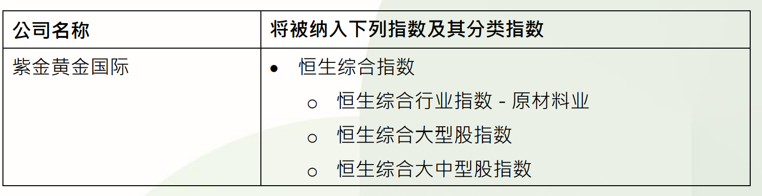消息方面:10月2日,恒生指數公司發佈公告,紫金黃金國際符合恒生綜合指數的快速納入規則要求,將於2025年10月15日(星期三)收市後被納入恒生綜合指數、恒生綜合行業指數—原材料業、恒生綜合大型股指數以及恒生綜合大中型股指數,並於2025年10月16日(星期四)起生效。