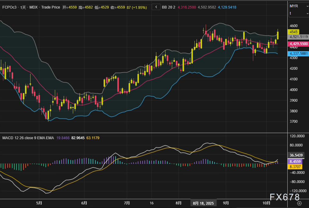 匯通財經APP訊——週三(10月8日),馬來西亞衍生品交易所棕櫚油主力合約FCPOc3收於4546林吉特/噸,單日大幅上漲76林吉特,漲幅達1.7%,創下自8月18日以來的最高收盤價。技術面上,布林帶上軌已上移至4503林吉特附近,而MACD柱狀線擴大至63.12,顯示市場做多動能顯著增強。