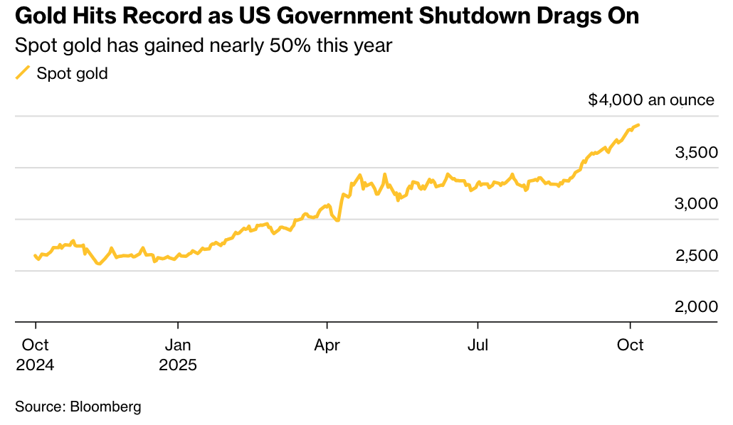 智通財經APP獲悉,由於美國政府持續關門帶來的不確定性加劇以及降息預期升溫,黃金價格週一再創新高。黃金現貨一度漲近1%,最高升至3920.77美元/盎司,再創歷史新高。黃金期貨同樣走強,最高升至3945.2美元/盎司,創歷史新高。數據顯示,黃金今年迄今已累計上漲近50%。