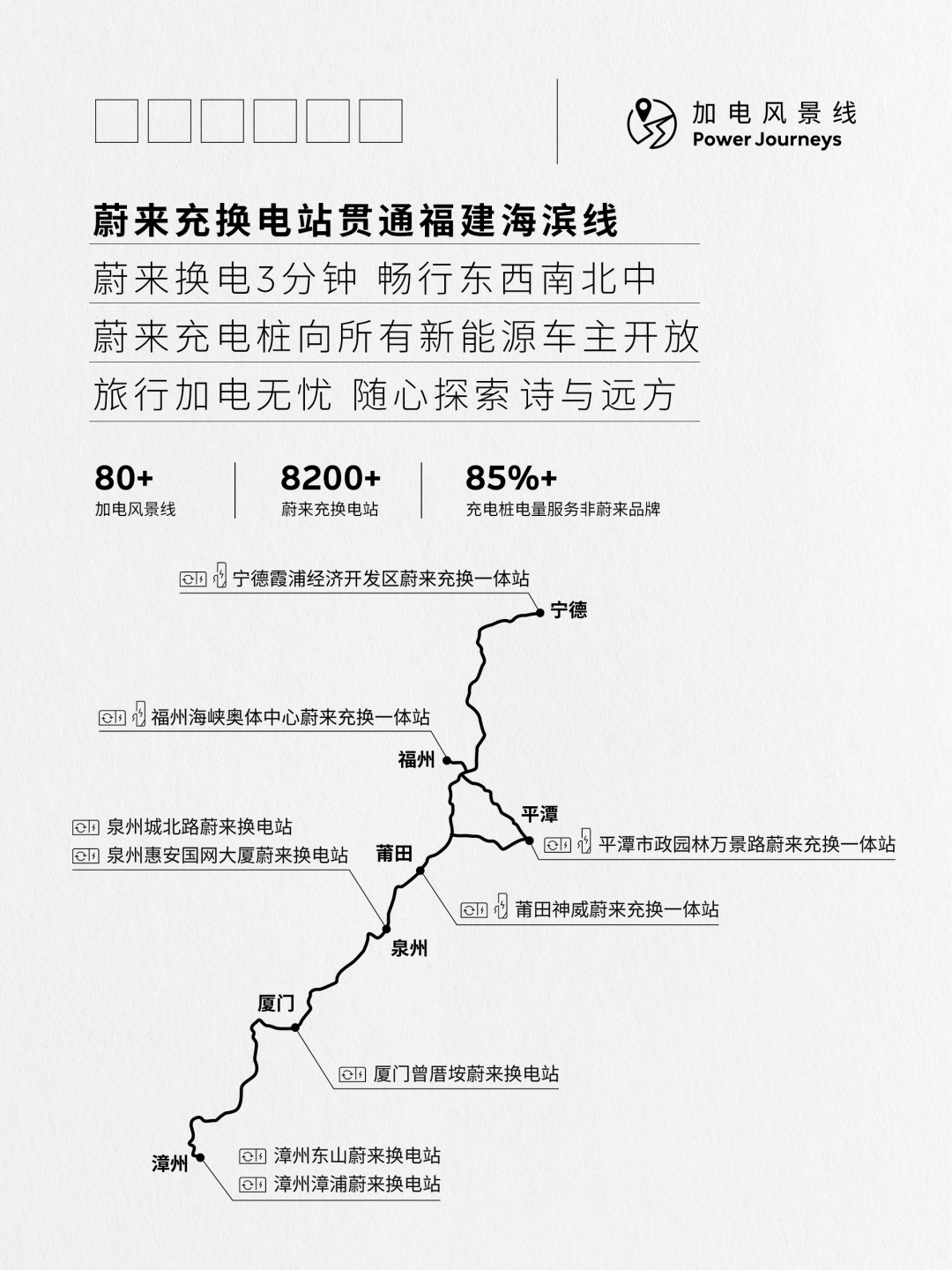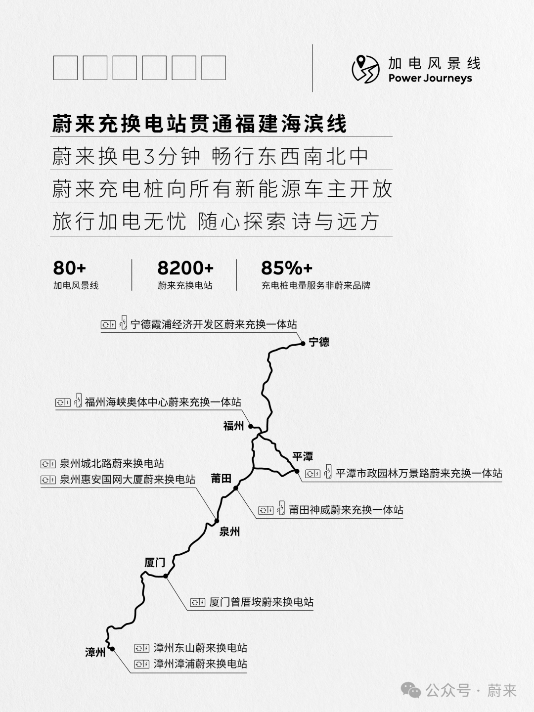 「加電風景線」是蔚來在2020年發起的能源佈局項目:在基礎設施不完善,但極具嚮往感的目的地部署充換電設施,滿足車主補能需求,讓油車能去的地方電車也能去,助力大家盡情探索旅程的旖旎風光和燦爛文明。截至目前,我們已經貫通了80條「加電風景線」。 如果你想尋找一條集碧海銀灘、千年漁村、地質奇觀與民俗文化於一體的海岸線,福建濱海風景線將是你的不二之選。一側是碧波萬頃,一側是層巒疊翠,堪稱中國東南沿海的「山海畫廊」。福建海濱線全程約740km,佈局9座換電站,4座充電站,覆蓋霞浦、平潭、廈門、漳州等核心區域。無論是馳騁東海1號公路追逐霞浦灘塗的鎏金晨光,還是平潭壇南灣夜追「藍眼淚」的熒光浪漫,亦或廈門環島路迎着海風騎行,蔚來都能為你的純電旅程提供堅實保障。同時蔚來充電樁面向所有新能源用戶開放,目前總電量有超85%都服務於其他品牌用戶。無論是換電還是充電,在NIO Power的陪伴下,大家都可以旅行加電無憂,隨心探索詩與遠方。這個秋天,正是濱海自駕的黃金時節。期待與你路上相遇,共赴這場跨山越海的浪漫之約!#蔚來換電去哪都方便 #自駕旅行首選換電 點擊即刻了解蔚來全系車型