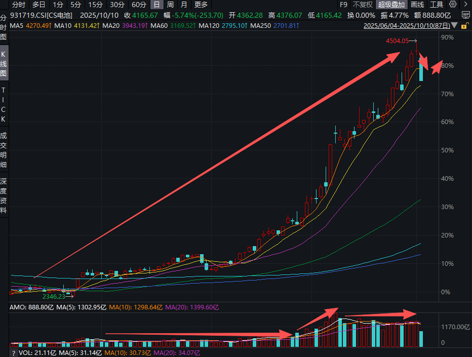 今天打開行情軟件的朋友怕是心裏一緊:電池、光伏板塊集體走低,中證電池指數一度跌超5.5%,截至11點,成交額砸到860億元,已超過昨日同期的一半。但老股民都懂,這種「綠盤暴擊」往往藏着機會——畢竟資金的動作從不說謊,10月9日節後首日就有1471億元的成交資金逆勢抄底,而且相對於9月初前連千億元都不到的成交額已有較大幅度的提升。