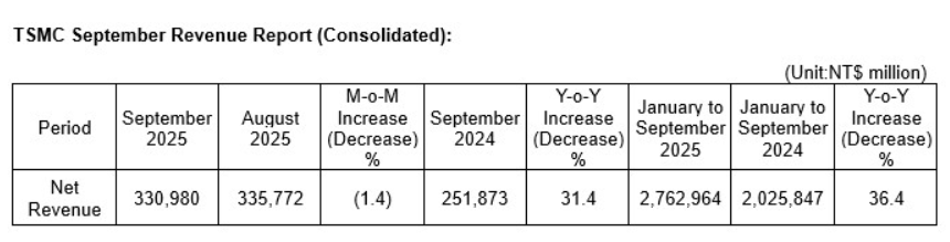 10月9日,臺積電公佈9月合併營收為3309.8億元新臺幣(單位下同),比上月減少1.4%,但較去年同期增加31.4%。第3季營收9899.18億元,續創單季歷史新高;累計前三季合併營收約2兆7629.64億元,較去年同期增加了36.4%。臺積電結算第3季合併營收9899.18億元,比前一季9337.92億元,季增6%。