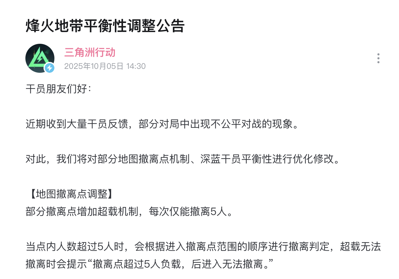 起因是一次突如其來的遊戲調整。10月5日,《三角洲行動》公告稱,近期收到大量玩家反饋,部分對局中出現不公平對戰的現象。對此項目組修改了部分地圖撤離點機制,每次僅能撤離5人;另對遊戲角色「深藍」屬性進行優化修改。