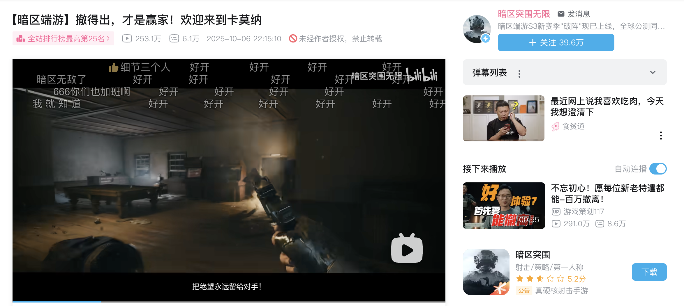 甚至是同為騰訊旗下的《暗區突圍》《暗區突圍:無限》也加入戰場,前者視頻標題為「永遠撤離,永遠突圍」,後者則為「撤得出,纔是贏家」,評論區裏有大量玩家留言「回頭是暗」,一時間成為射擊遊戲玩家之間流行的口號。