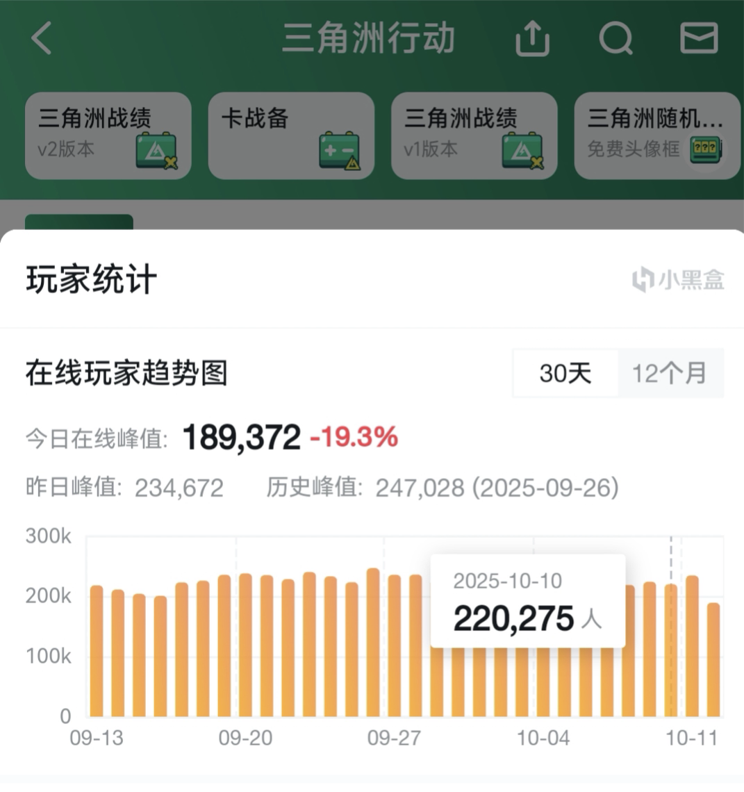 《三角洲行動》10月10日在線玩家峯值。(圖源:小黑盒截圖)