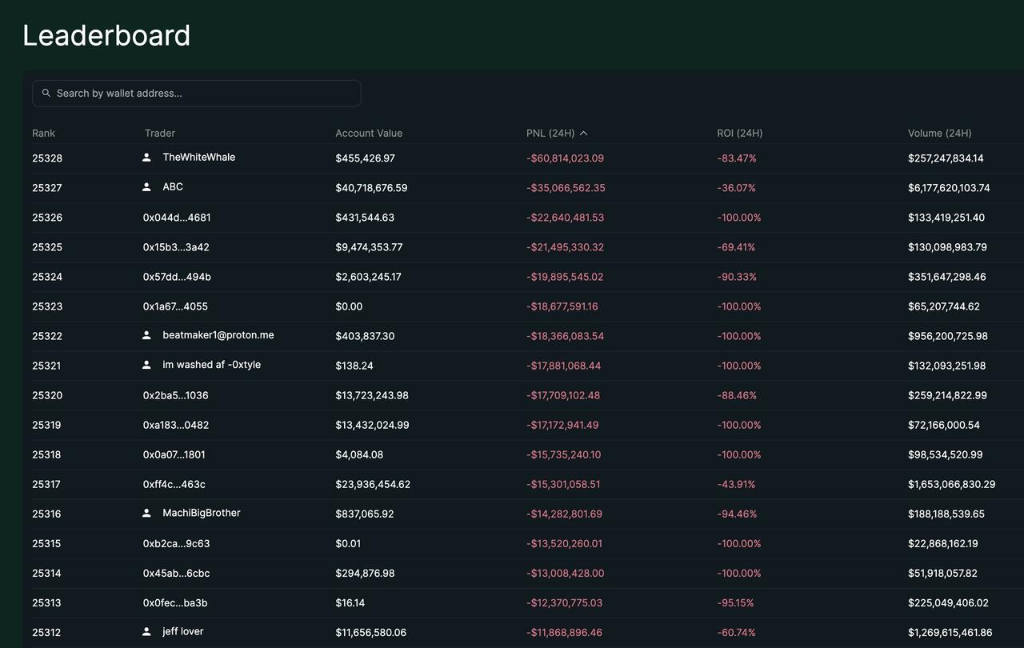 據社交媒體賬戶@LookOnChain披露,在這次市場崩盤中,Hyperliquid上有超過1000個錢包被完全清空,另有超過6300個錢包處於虧損狀態,合計損失超過12.3億美元。