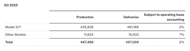 然而,這些數據背後有兩個關鍵細節需重點關注:首先,該季度交付量比產量高出 10% 以上。由於 9 月底美國聯邦電動汽車稅收抵免政策即將到期,消費者急於購車以享受優惠,特斯拉藉此消化了過剩庫存。這一需求驅動因素具有一次性屬性,而公司並未相應擴大產能,也印證了這一點。