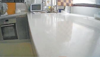 李女士家住13號樓,2016年入住至今一遇颳風下雨,廚房窗戶上方及燃氣爐旁便會漏雨,嚴重時,廚房牆縫裏、檯面上、櫥櫃裏及地板上全是水。為防止家裏被淹,李女士在廚房裝了一個攝像頭,專門用於監控漏雨,「一到汛期,我們就在廚房檯面上、地板上鋪上毛巾被、牀單等吸水。漏雨嚴重時,如果在外面忙回不了家,就請附近的親戚幫忙去家裏清理積水。」