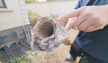 今年5月,尹先生再次要求開發商維修,「開發商說我們可以自己找人先修,到時再報銷維修費用。」在一位專業防水人員的建議下,房子東、西及北側的回填土方相繼被挖開,這才發現進入室內的污水管東側斷了兩根,北側斷了一根。「令我們憤怒的是,之前的維修人員應該已發現污水管斷成了兩截,但他們並沒更換,而是用油氈將兩根斷管纏裹了事。這樣簡單粗陋的維修,家裏能不進污水嗎?」尹先生說。直到此次自己找人維修,這3根污水管才被更換。