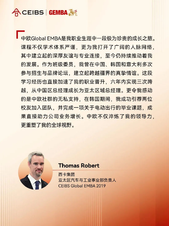 作為亞洲最具規模的國際EMBA項目,中歐Global EMBA每年匯聚了約百名背景多元的高管與企業家,其中超四成為國際學生,近三分之一常駐海外,構成了一個真正活躍的全球學習社羣。同學們共享資源、共創機會,真正實現了「鏈接全球、賦能彼此」的網絡效應。這一網絡的價值,在排名中得到有力印證:「校友網絡」指標從第18位躍升至第8位,表明中歐校友網絡是一個具有高度凝聚力與互惠價值的全球社羣;「工作經驗」指標也從第9位提升至第5位,體現了課程對全球最資深管理者的強大吸引力。中歐的使命不僅限於提供一段變革性的學習旅程,更在於搭建一個支持職業發展與個人成長的終身平臺。
