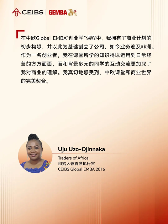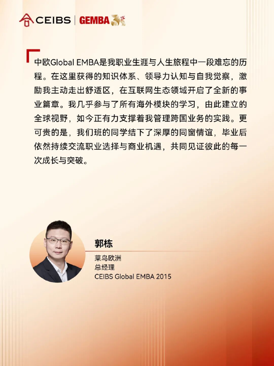 中歐國際工商學院副院長兼中方教務長朱天表示,「這份成就屬於全體中歐校友,源於校友網絡的強大力量。每位校友,都是中歐精神在全球範圍內的「代言人」。正是中歐校友們在職業道路上的持續精進與卓越成就,為課程的全球聲譽提供了最生動的註腳;也正是校友們對學院的深切認同與支持,構築了中歐社羣最堅實的基石。全球91個國家和地區的33000多名校友織成了緊密的校友網絡,成為推動中國和世界交融發展的中流砥柱,用實際行動詮釋了「學院與校友發展共同體」的深厚內涵。」