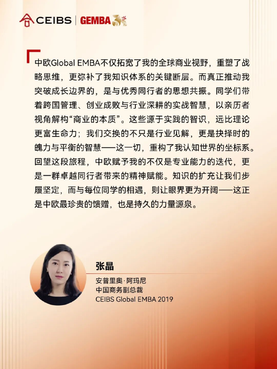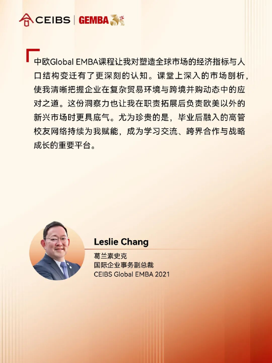 中歐國際工商學院副教務長、中歐Global EMBA課程主任芮博瀾表示,「這不僅是一份榮譽,更是對我們持續踐行使命的高度肯定。面對複雜多變的商業環境,中歐Global EMBA始終堅持系統融合學術前沿與商業實踐,全面提升學生領導力,倡導可持續發展與負責任的管理理念。我們相信,未來的管理者不僅需具備領導力,更要兼具責任感、同理心和敏捷力,勇於直面前所未見的艱鉅挑戰,才能帶領企業蓬勃發展。中歐Global EMBA將不斷進取、開拓創新,培養更多能夠引領未來、貢獻社會的傑出領導者。」