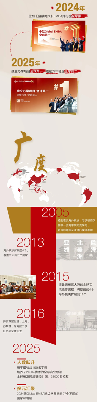 此次排名不僅凸顯了中歐Global EMBA在全球管理教育界的領先地位,也樹立起課程三十年繼往開來、乘風破浪的一座里程碑。這既是對課程30年辦學征程的圓滿註腳,更是邁向未來的全新起點。展望未來,中歐Global EMBA課程將一如既往為全球領導者創造價值,不斷深化中國與世界的對話交流,鞏固全球管理教育第一陣營的領先者地位,推動中歐朝着成為全球最受尊敬的國際商學院這一願景堅定邁進。