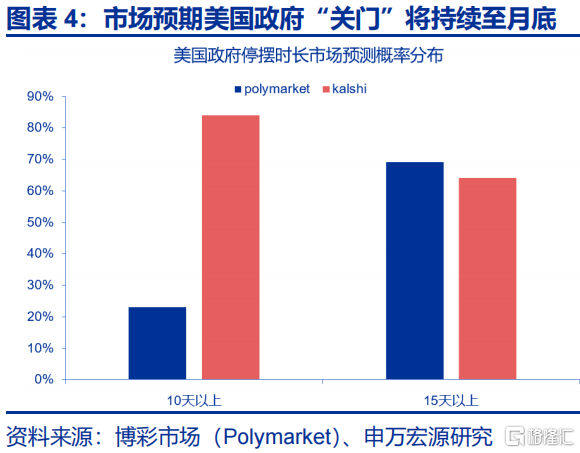 第二,如果美國政府「關門」延期至10月下旬,時長將遠超歷史中位數,或在中下旬重新成為美元貶值的驅動力之一。博彩市場預測顯示,停擺15天以上的概率達67%。
