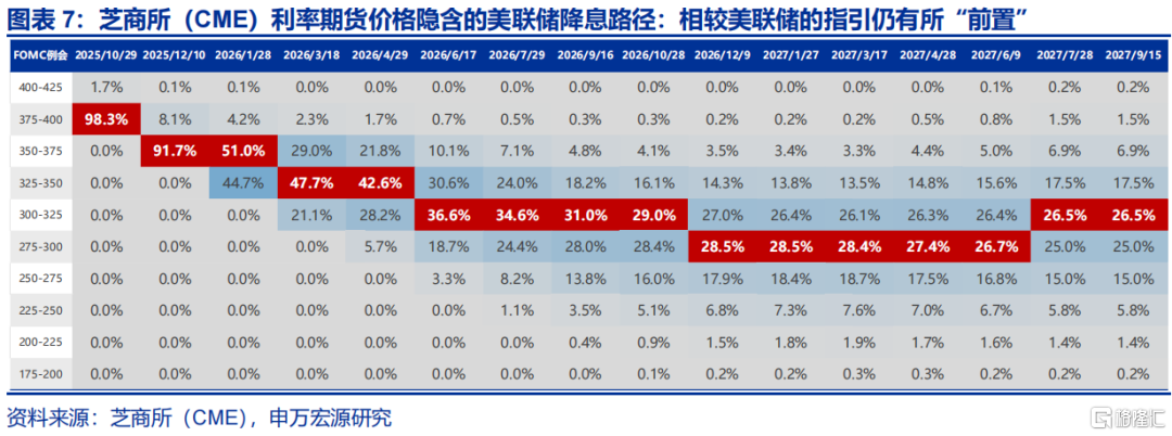 當前市場定價至2026年底聯儲局降息4-5次(今年2次,明年2-3次),相較聯儲局9月點陣圖的指引依然有一定的「前置」(今年剩餘2次,2026年降息1次)。我們建議以2-4次為基準假設(今年1-2次,明年1-2次)。極端假設下,假設明年降息0次,對應美元指數102左右(未考慮其他因素的疊加)。