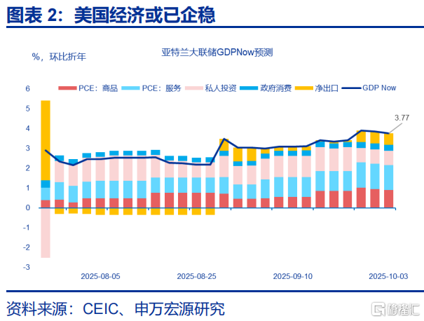 第一,10月上旬第二階段的美元反彈與美國經濟基本面「脫鉤」。然而,勞動力市場降溫預期被證僞還需要時間,雖然美國經濟依然有韌性。美國政府「關門」期間,非農等多項關鍵數據推遲發佈,PMI、ADP等數據並未指示經濟顯著降溫。所以,美元、美債和聯儲局的降息預期並不同步。雖然美國經濟有韌性,亞特蘭大聯儲GDPNow預測美國三季度GDP增速或高達3.77%,但就業轉弱纔是聯儲局降息鞠策的「主要矛盾」——證僞還需時間。