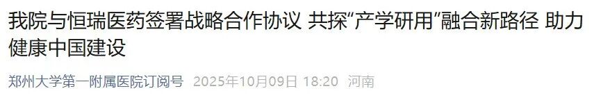 據鄭州大學第一附屬醫院訂閱號消息,10月9日上午,鄭州大學第一附屬醫院與江蘇恆瑞醫藥股份有限公司(以下簡稱「恆瑞醫藥」)在東院區正式簽署戰略合作協議。