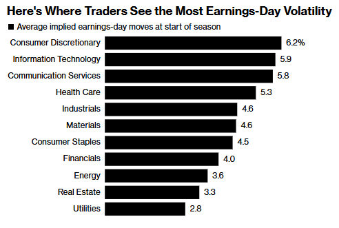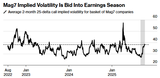 期權交易者已推高了標普 500 指數成分股的引伸波幅,這很可能反映出他們在關注人工智能和大型科技公司的情況下,對七大科技巨頭股票進行押注。那些想要構建分散投資組合的投資者可能會關注財報公佈後的股票走勢,因為引伸波幅通常會下降,摩根大通在 8 月份指出,這種效應在上一財年財報季之後尤為顯著。