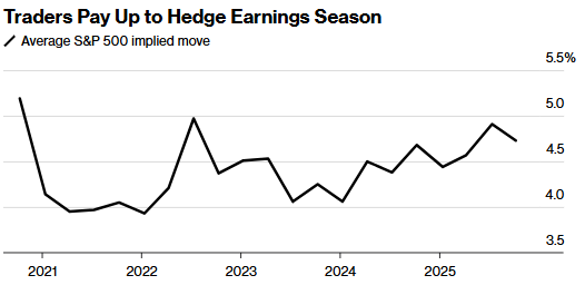 花旗策略師們在上週的一份報告中寫道:「投資者仍預期個股消息會推動近期的市場波動,但與上一季度不同的是,期權價格已有所上漲,這表明投資者已預期到這種波動性。」