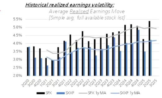 瑞銀的策略師們表示,企業財報公佈後的股票波動在上個季度達到了峯值,此後一直在美國呈上升趨勢,歐洲也是如此。在花旗分析師則指出,股票之間的相關性極低,實際波動率和引伸波幅均接近至少十年來的最低水平。