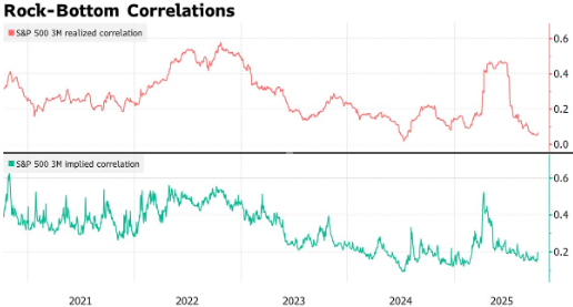 支撐指數小幅波動上漲的一個因素是低相關性。與標普500指數相比,單個股票的波動性更大,但它們的走勢卻各不相同,這有助於抑制指數的波動幅度。而如今,由於特朗普的關稅威脅這一宏觀衝擊的出現,一些相關性可能會重新上升。