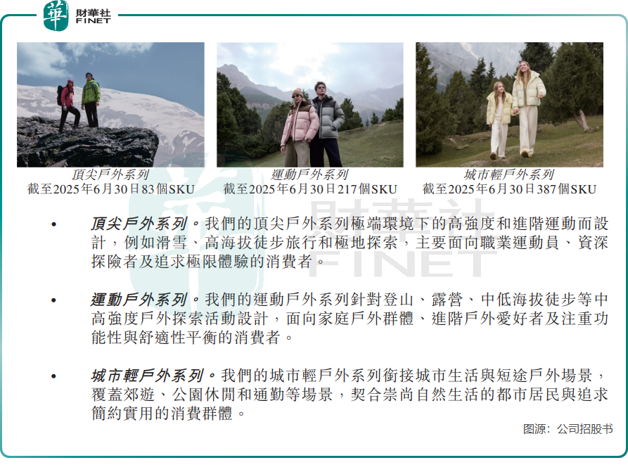 公司的產品組合包括三大系列,即頂尖戶外系列、運動戶外系列與城市輕戶外系列,各系列旨在滿足不同穿着場景,涵蓋滑雪、登山和徒步等各種自然環境活動,以及郊遊、公園休閒和通勤等城市場景。