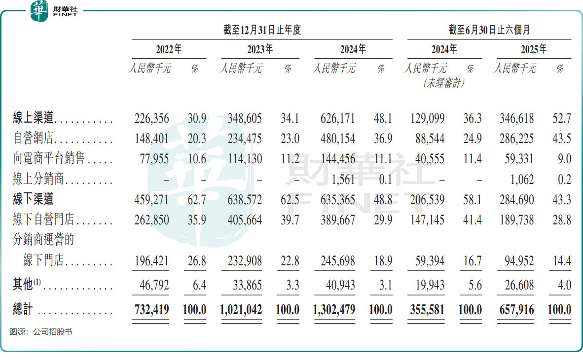 其中,線上自營門店增長最為迅猛,收入佔比從2022年的20.3%大幅提升至2025年上半年的43.5%,成為推動公司收入增長的「主引擎」。