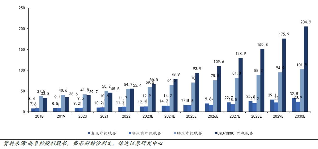 藥物研發外包服務涵蓋CRO服務(藥物發現、臨牀前研究、臨牀研究)與CMO/CDMO服務(小分子藥物及生物製劑)。弗若斯特沙利文預計,全球藥物研發外包市場規模2018–2022年從867億美元增長至1330億美元,複合年增長率(CAGR)達11.3%;預計2023–2030年將從1512億美元進一步擴張至3632億美元,CAGR提升至13.3%,呈加速增長趨勢。