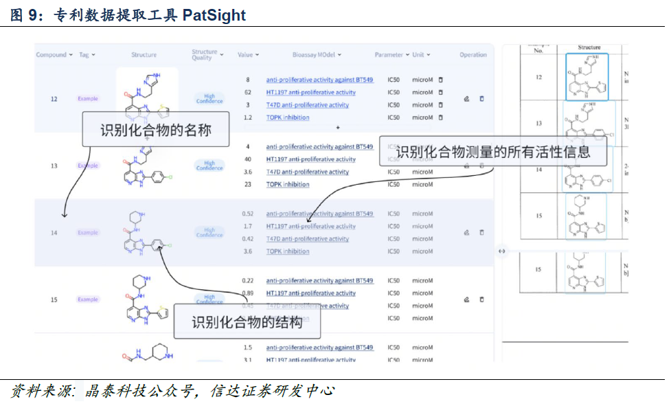 晶泰控股專利數據提取工具PatSight可高效、便捷且精準地從專利PDF中提取化合物數據並支持SAR分析,為藥物研發提供有力支撐。僅需上傳專利PDF文件,即可在1小時內完成90%專利的化合物數據提取,結合晶泰雲端數據管理與分析平臺MolValley平臺還能進一步開展SAR分析。可以集中、系統的管理分子結構和活性數據,並提供構效關係分析工具,助力用戶高效的解析小分子化合物結構與生物活性間的奧祕。