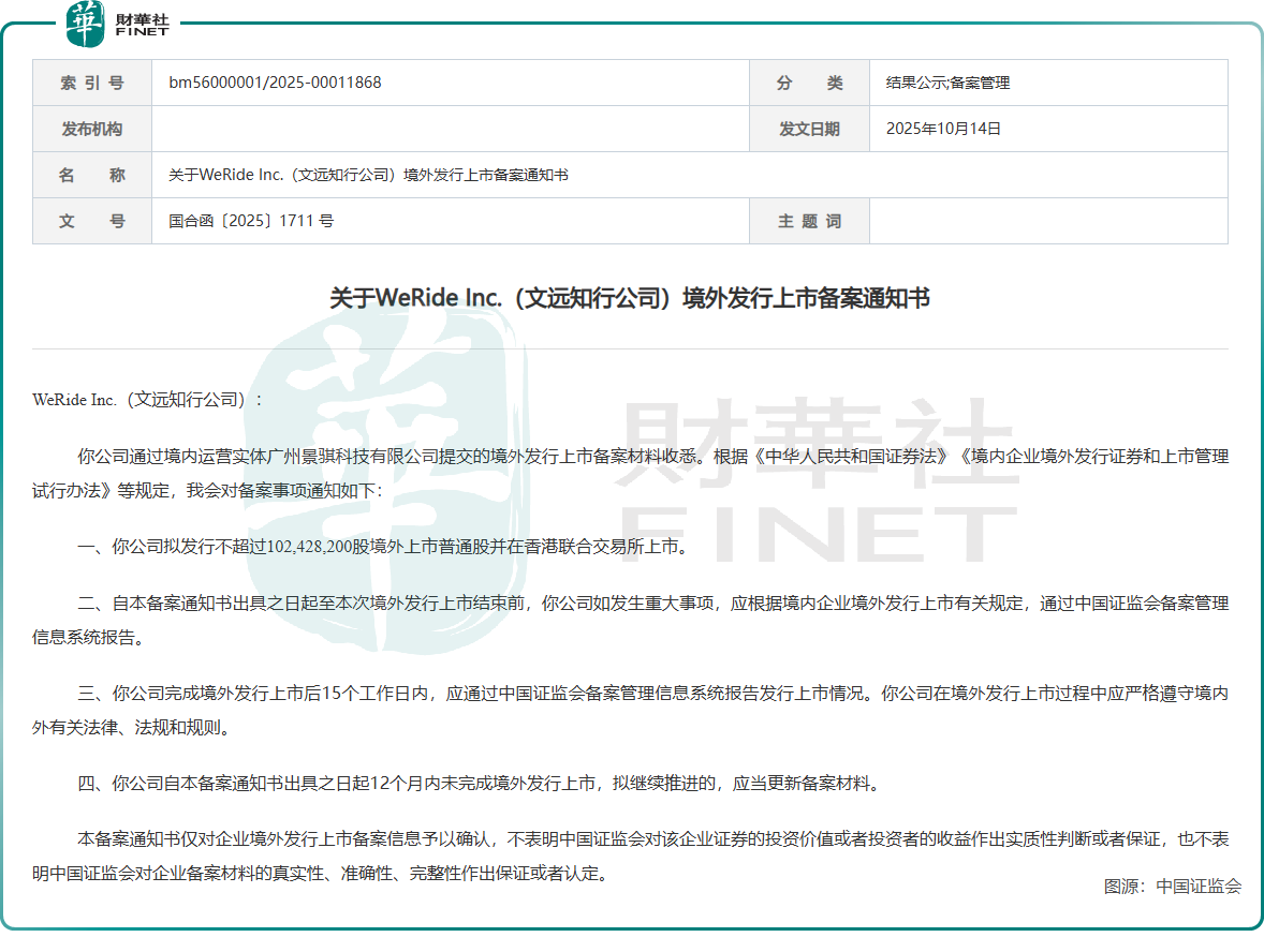10月14日,中國證監會發布關於Pony AI Inc.(小馬智行股份有限公司)和WeRide Inc.(文遠知行公司)境外發行上市備案通知書,標誌着兩家公司自今年3月傳出的港股上市計劃取得重要進展。