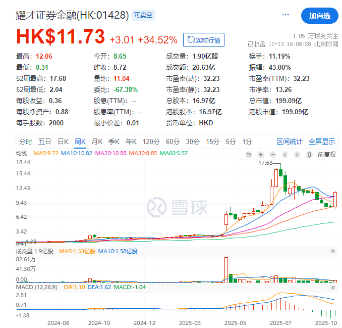 10月13日下午,港股上市公司耀才證券金融股價一度大漲37%,股價收盤報11.73港元。