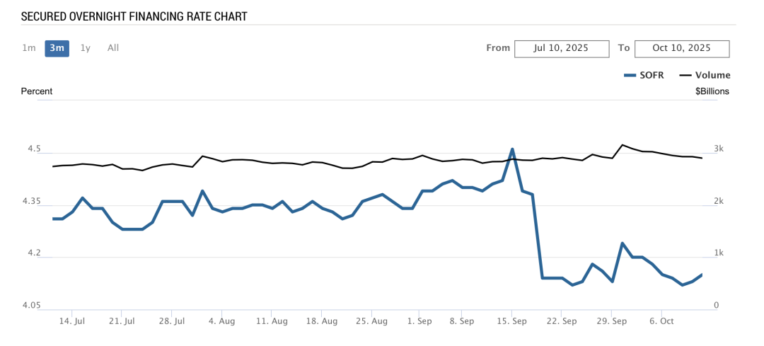 理解了這一機制之後,我們再來看上圖就明白了:9月15日左右,SOFR短暫出界:突破了4.5%的上限(當時聯儲局政策利率FFR還是4.25-4.5%)。這就是鮑威爾嘴裏所說的:「特定日期出現的更明顯但暫時的壓力」。