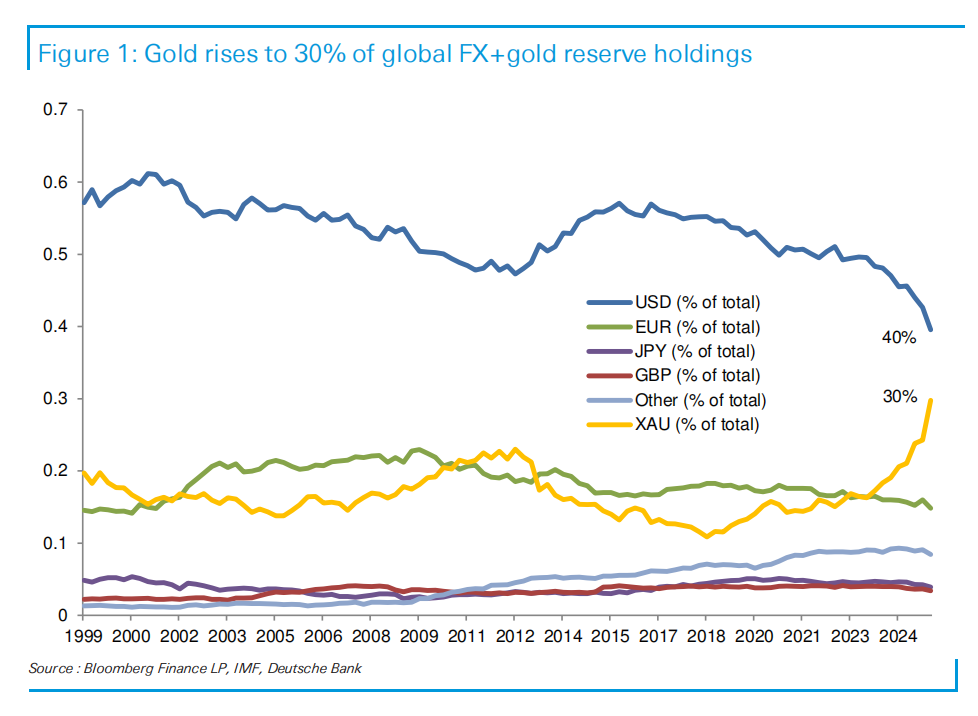 根據德意志銀行分析師Michael Hsueh在10月17日發佈的報告,黃金在全球央行「外匯+黃金」儲備中的份額已從今年6月底的24%迅速上升至當前的30%。在同一時期,美元的份額則從43%下降至40%。這一動態反映了黃金作為儲備資產的吸引力正在持續增強,而美元的主導地位則相對削弱。
