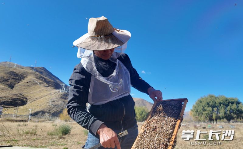 長沙晚報掌上長沙10月18日西藏貢嘎訊(全媒體記者 孫佔鋒 通訊員 邊巴曲培)「這個冬天蜜蜂的‘口糧’穩了。」在位於貢嘎縣江塘鎮的蜂巢壹號蜂場內,頭戴面罩的養蜂技術人員張華正俯身掀開箱蓋,指尖輕捏巢脾對着光照仔細查看。日前,本報援藏記者走進西藏巔峯貢蜜蜂蜜製品有限責任公司,探訪了這家甜蜜值最高的長沙援藏企業。