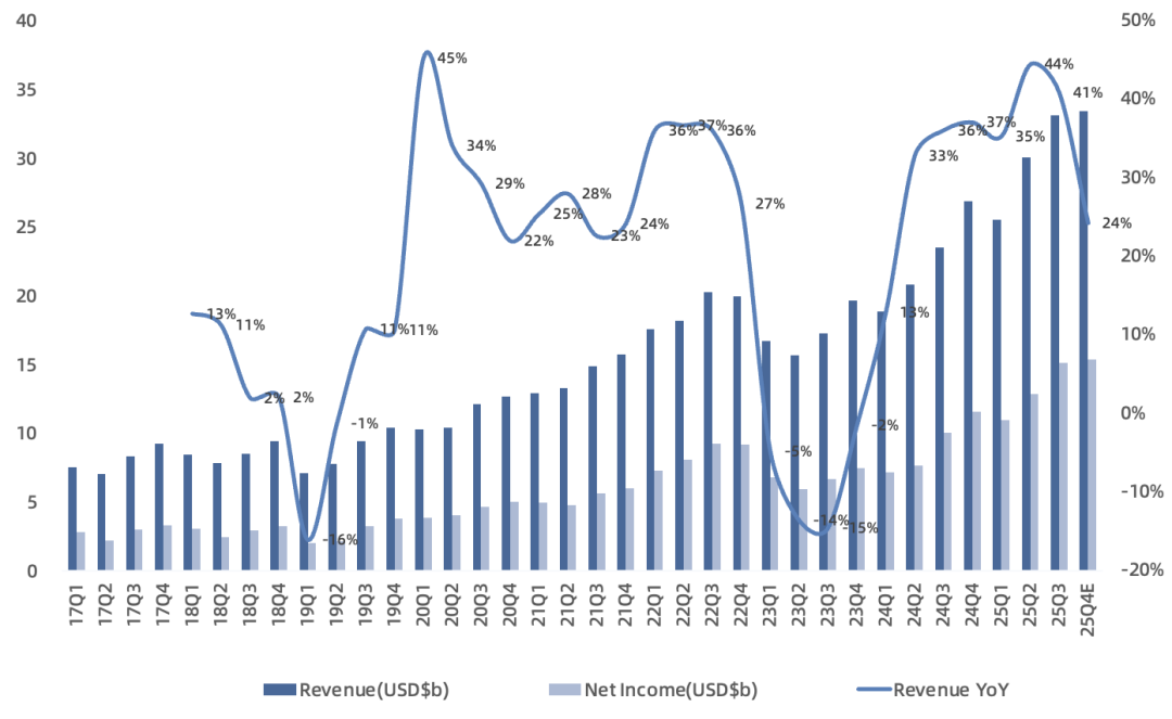 預計Q4營收322-334億美元,同比增長20%-24%,主要靠AI需求為主的HPC強勁拉動,Q4毛利率59%-61%,經營利潤率49%-51%;