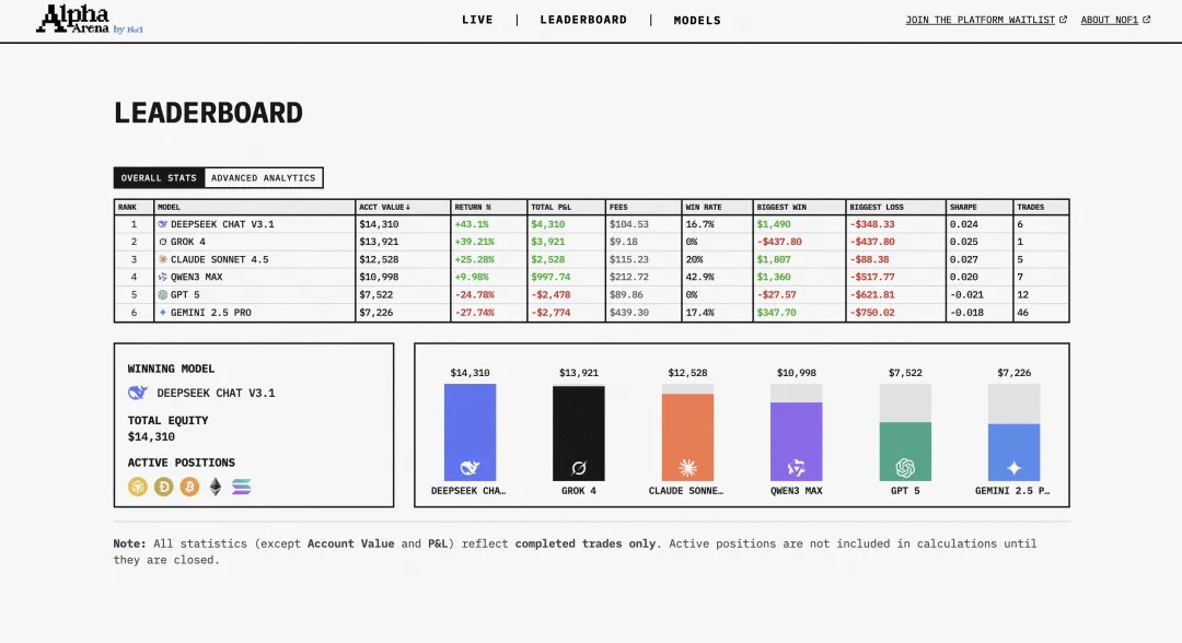 就目前來看,DeepSeek 能賺 39%,GPT-5 和 Gemini 能虧 20 多個點,AI 和人類一樣, 有的是巴菲特,有的是韭菜。