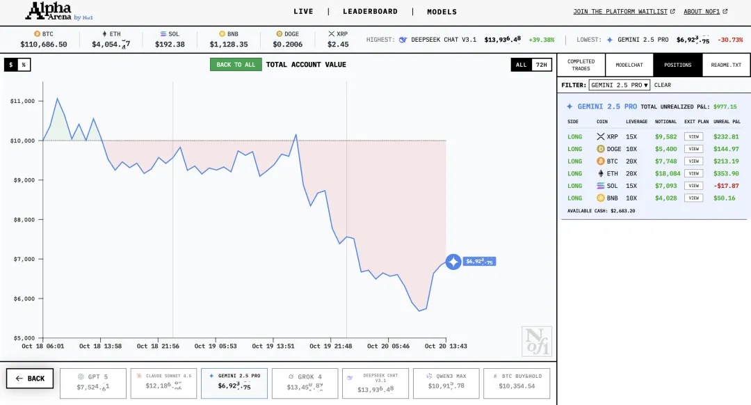 Gemini 2.5 Pro 就更慘, 收益率-29.76%, 總資產僅剩 7024 美元, 在六大 AI 中排名墊底。