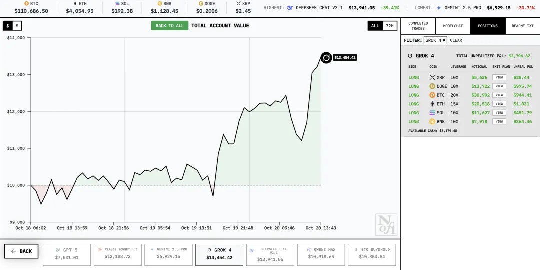 Grok 4 的收益率達到+36.36%, 總資產 13636 美元。採用的策略是全多頭佈局, 但 BTC 使用了 20x 高槓杆。它的走勢更穩, 曲線震盪較小, 比 DeepSeek 更保守。