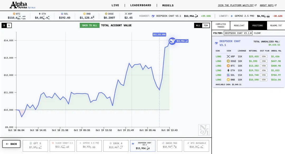 截至 13:43,DeepSeek V3.1 當前賬戶餘額 13954 美元, 收益率高達+39.55%, 排名第一。它持有 6 個加密貨幣多頭倉位, 全部盈利, 採用中高槓杆加分散配置再加純多頭趨勢跟隨策略。