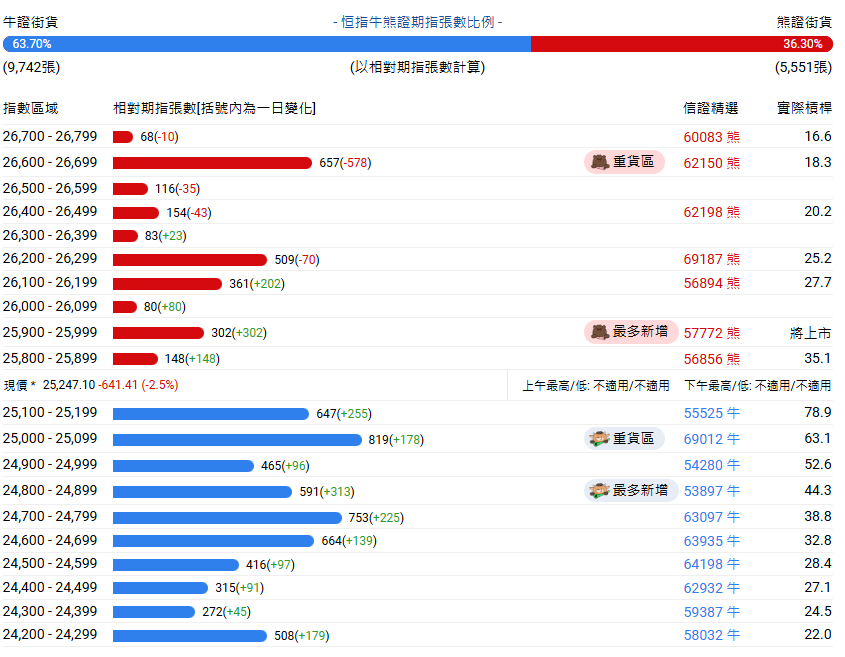牛證街貨重貨區在25000-25099區間,該區間最新牛證數量為819張,較上一交易日增加178張;牛證街貨最多新增在24800-24899區間,該區間最新牛證數量為591張,較上一交易日增加313張。