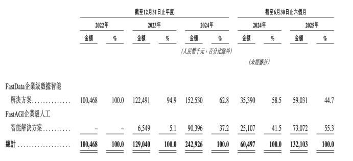 更值得注意的是其業務結構的變化。分產品線來看,FastAGI企業級人工智能解決方案在2023年推出後收入急劇增長,從2023年的655萬元增長至2024年的0.9億元,截至2025年上半年,該業務的營收為0.73億元,同比增長192%,明顯高於FastData企業級數據智能解決方案同期68.57%的營收增速。這也推動FastAGI企業級人工智能解決方案在滴普科技營收總額的佔比從2023年的5.1%提升至2025上半年的55.3%,成為公司新的增長曲線。