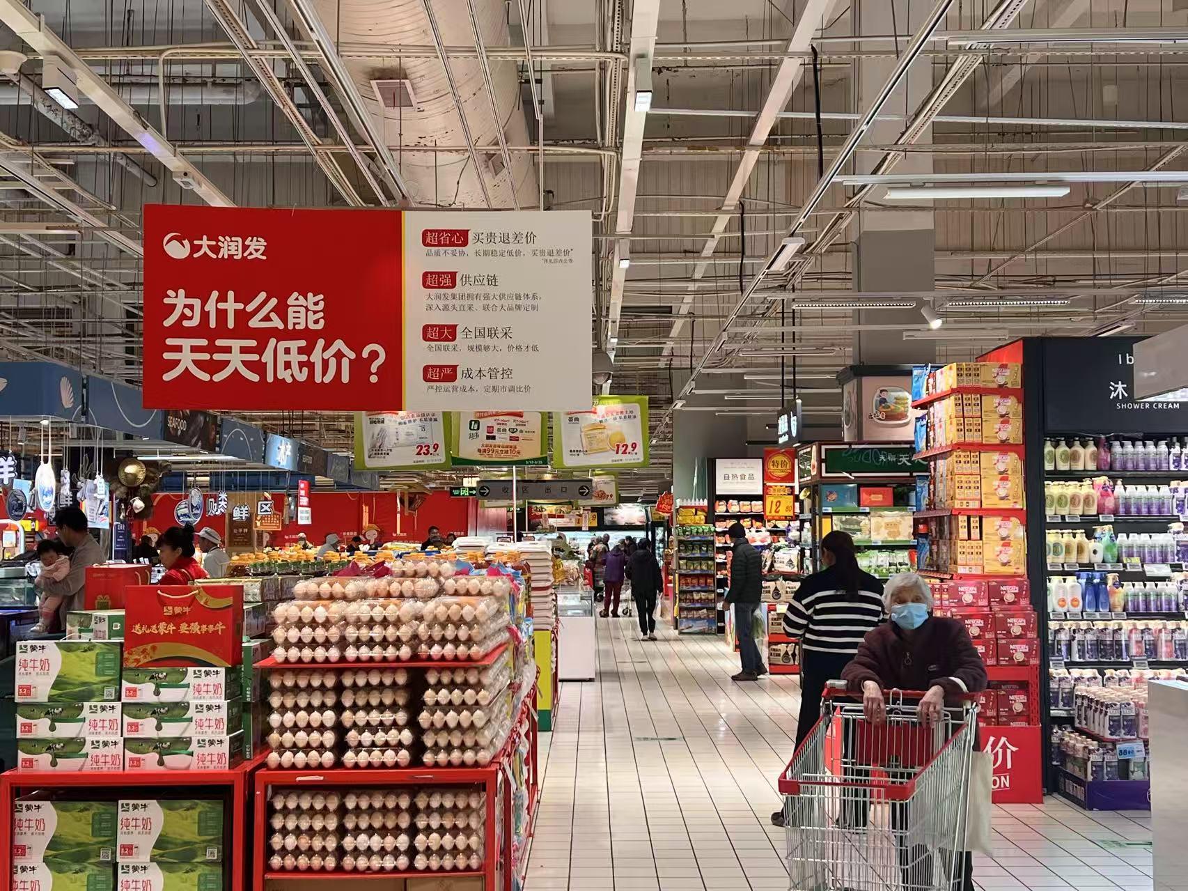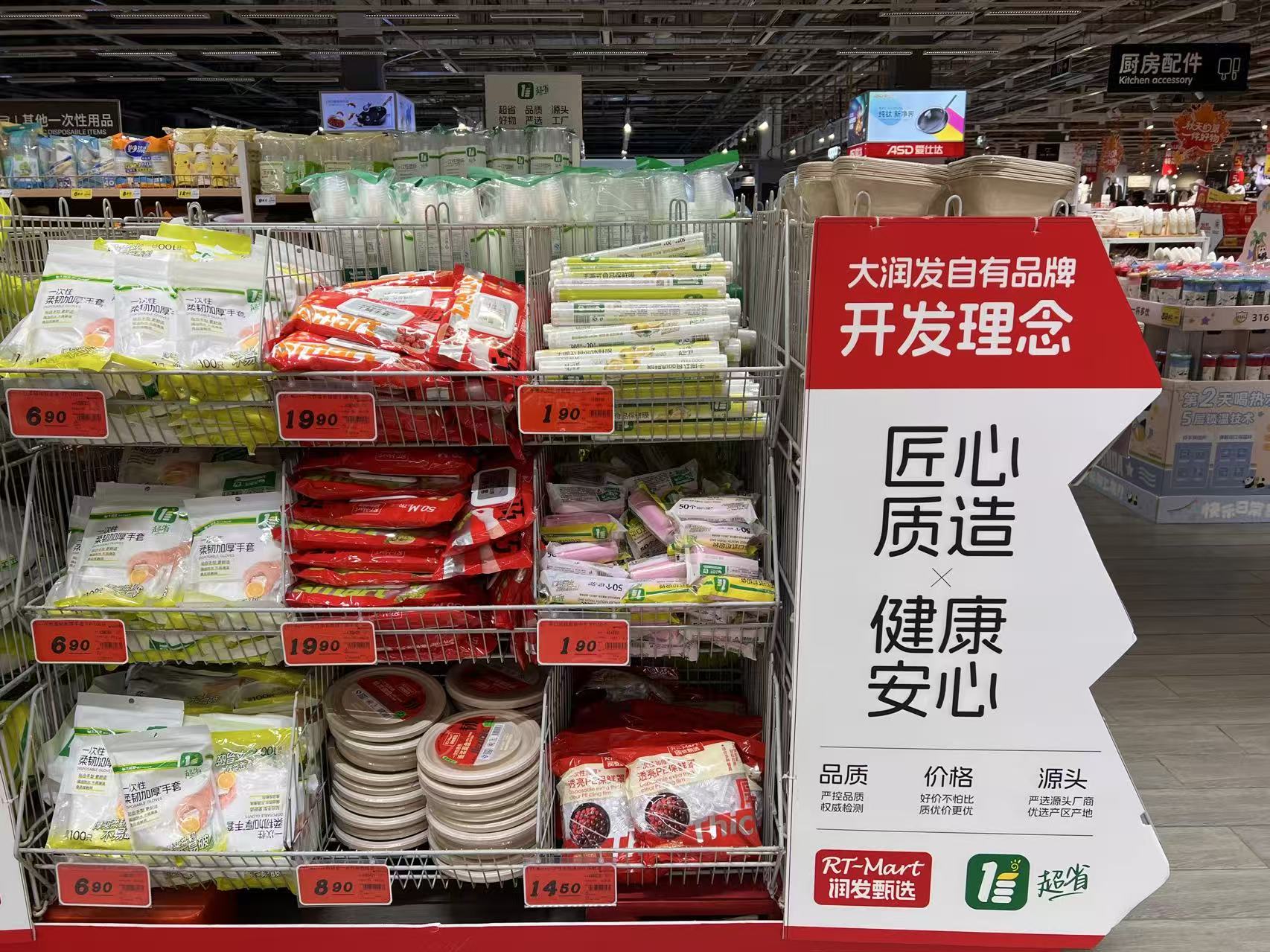 10月21日,在大潤發上海門店,藍鯨記者注意到,潤髮甄選系列擺在商場顯眼處、配有明確標識,手撕式保鮮膜1.9元、一次性保鮮膜罩4.9元、手撕豬肉鋪每袋11.8元,高鑫零售表示,多款爆款直接對標電商底價。