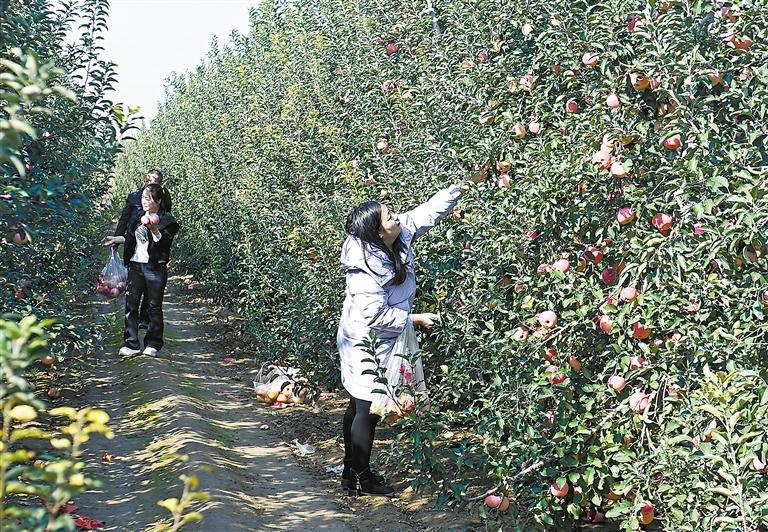 圖為大城縣廣安鎮西馬村蘋果種植基地,遊客在採摘蘋果。