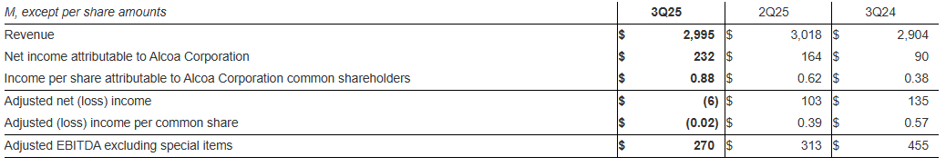 財報具體數據顯示,美國鋁業第三季度營收達29.95億美元,較上年同期的29.04億美元實現增長;歸屬於公司的淨利潤為2.32億美元,上年同期為9000萬美元,同比增長近158%;調整後淨虧損600萬美元,上年同期淨利潤為1.35億美元;調整後每股虧損0.02美元,上年同期每股收益0.57美元;調整後息稅折舊攤銷前利潤(EBITDA)為2.70億美元,上年同期為4.55億美元。