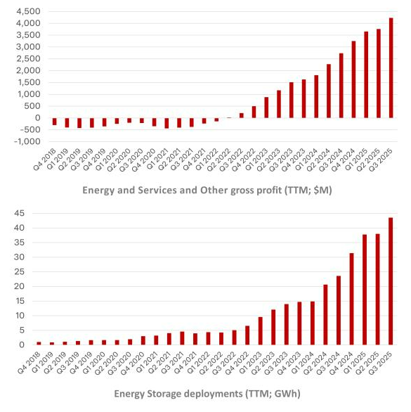 2025年第三季度,特斯拉營收281億美元,比去年同期增長12%;淨利潤13.7億美元,同比下降37%。其中,能源與儲能業務收入34.15億美元,同比增長44%。