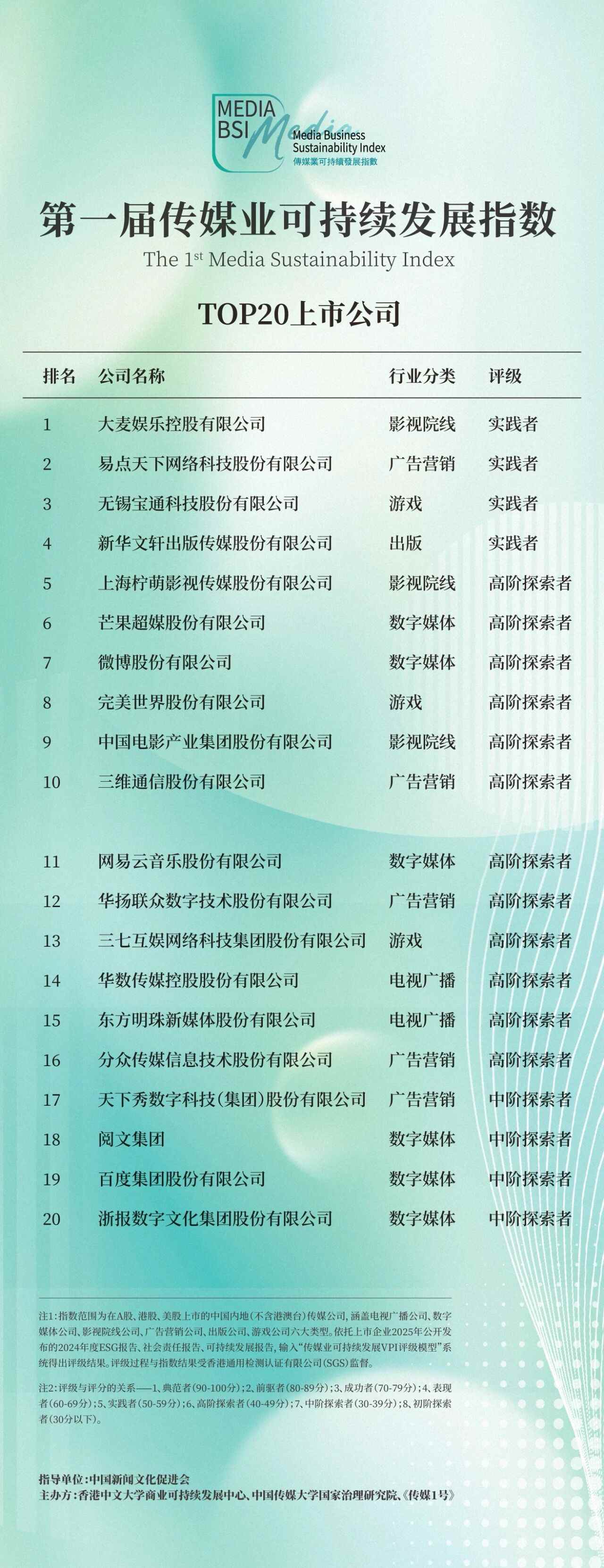 據介紹,「第一屆傳媒業可持續發展指數」以「傳媒業可持續發展VPI評級模型」為依託,是對中國內地上市傳媒企業可持續發展ESG表現的數據化、科學化剖析,其評級過程與指數結果受香港通用檢測認證有限公司(SGS)監督。本屆評選歷時三個月,共計有85家在2025年已發佈2024年度ESG報告、社會責任報告、可持續發展報告的中國內地上市傳媒公司被計入指數範疇,涵蓋廣告營銷公司、數字媒體公司、遊戲公司、影視院線公司、出版公司、電視廣播公司六大類型。最終,大麥娛樂以最高評分和「實踐者」的最優評級脫穎而出。