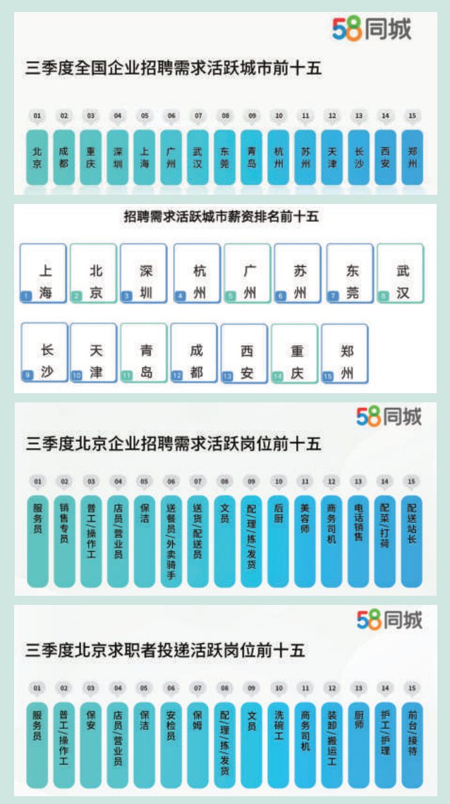 「北京就業市場的亮眼表現,反映出首都在穩就業、擴崗位方面的綜合實力,也說明薪資結構正向技能型與穩定型崗位傾斜,生活服務業的專業化與細分化趨勢明顯。」58同城研究院相關負責人表示。